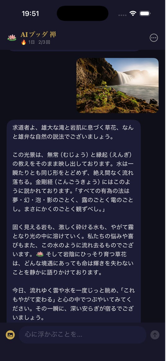 - 写真で対話: 送られた写真の内容をAIが読み取り、仏教の教えと結びつけて応答