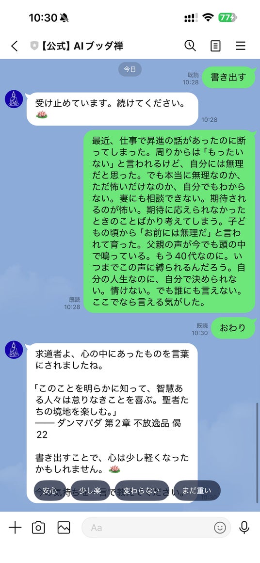 「おわり」と送ると、書き出された内容全体をRAGで分析し、最もふさわしい経典の偈句を一つだけ選んでお伝えします。「書き出すことで、心は少し軽くなったかもしれません」という言葉とともに、今の気持ちを「安心」「少し楽」「変わらない」「まだ重い」の4段階で記録する機能も提供します。