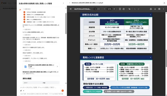 AIが「比較表を作成中」「デザイン案を生成中」といった進捗を画面上でリアルタイムに表示。「フォントをもう少し大きく」「競合にC社も追加して」といった修正指示を追加することも可能です。