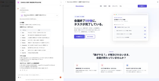 さらに、発言内容を理解したAIと対話することで、会議内容の確認や次のアクションの抽出、記事構成の提案なども可能です。議事録ツールとしての枠を超え、会議に参加して理解・整理・提案まで行うAIエージェントとして、業務の効率化と情報活用を支援しています。
