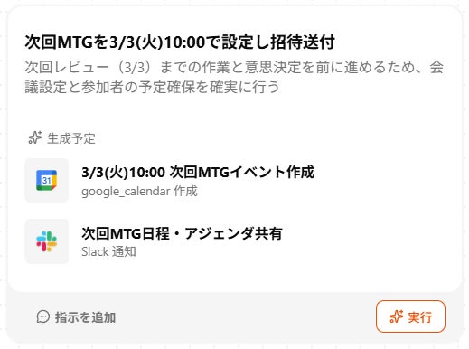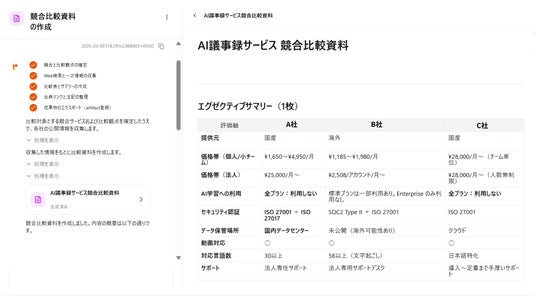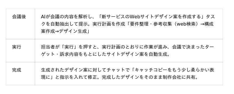 ▲会議をするだけでタスクの実行計画をAIが作成。実行ボタンを押すだけで成果物が生成。