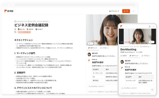Rimo合同会社(本社:東京都渋谷区、代表:相川直視、以下Rimo)は、AI議事録サービス「Rimo Voice」の新機能として、会議の決定事項をAIがタスク化し、デザイン・図表・文書・メールなどの成果物の生成まで自動実行する「Rimo Actions」の正式提供を開始しました。