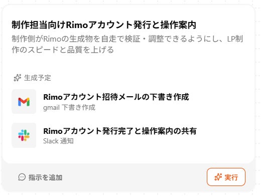 「Rimo Voice」で作成した議事録をもとに、AIが会議後のタスクを自動抽出。各タスクに対する実行計画をAIが立案・提案し、ユーザーは内容を確認して実行ボタンを押すだけで作業が進みます。計画の修正が必要な場合は、AIへの追加指示で柔軟に対応可能です。