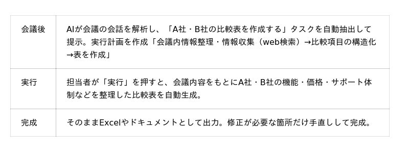 議事録作成のAIから、自ら考え実行するAIへ。資料・図表作成やカレンダー予定登録まで、「会議後のアクション」を自動で実行。