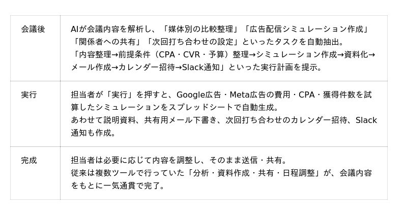 事例4. マーケティング会議から広告シミュレーションの自動生成とメールやカレンダー登録も
