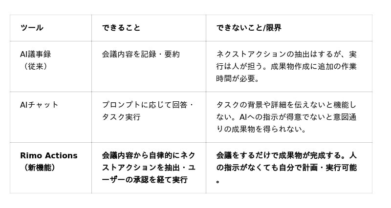 AIに慣れたユーザーであれば、Rimo Actionsが会議内容をもとにAIが自律的に実行計画を立てることで、プロンプトを考える手間や、どのツールに何を頼むかという判断から解放されます。