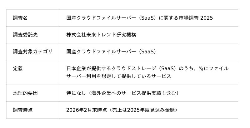 ファイルフォース株式会社(本社:東京千代田区 代表取締役:サルキシャン アラム)は、提供する純国産クラウドストレージ「Fileforce」において、当社委託の第三者調査機関(株式会社未来トレンド研究機構)「国産クラウドファイルサーバー(SaaS)に関する市場調査 2025」において、「導入社数シェアNo.1」※1および「年間売上金額シェアNo.1」※2 を獲得したことをお知らせします。