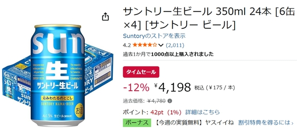 現在開催中のAmazonタイムセールで、「サントリー生ビール 350ml 24本」が対象となっており、1本あたり約175円で購入できます。