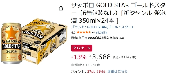 現在開催中のAmazonタイムセールで、「サッポロ GOLD STAR 350ml×24本」が13%オフとなっています。