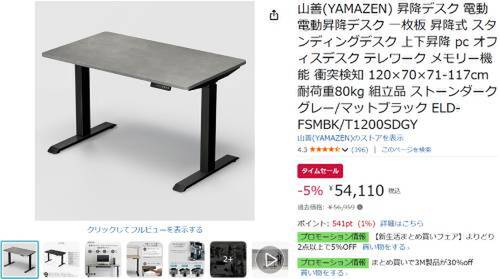 山善の電動昇降デスク「ELD-FSMBK/T1200SDGY」がAmazonタイムセール対象。参考価格56,959円のところ、5%オフの54,110円で販売中。