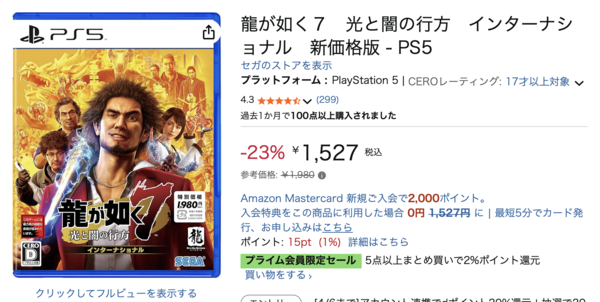 龍が如くをもっと遊びたい人にオススメするなら、(もうプレイ済みかもしれませんが)「龍が如く7 光と闇の行方 インターナショナル 新価格版」です。参考価格は1,980円ですが、Amazonでは23%オフの1,527円(3月24日現在)。お買い得ですね。