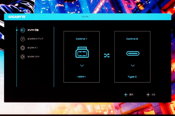 本機が「仕事にも使えるゲーミングディスプレー」として際立っているのは、内蔵KVMスイッチの存在が大きい。KVMとはKeyboard・Video・Mouseの頭文字であり、1組のキーボードとマウスを複数のPCで共有できる機能を指す。