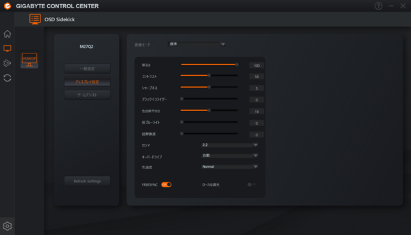 明るさ・コントラスト・シャープネス・色の鮮やかさ・オーバードライブといった項目をスライダーで手軽に調整でき、FreeSyncのオン/オフも切り替えられる。仕事中のカラーモードとゲーム用プリセットを素早く行き来したいユーザーには、地味ながら実用的な機能だ。