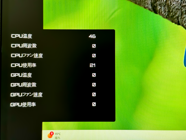 CPU/GPUの温度や使用率を画面にオーバーレイ表示。ゲームの負荷状況をリアルタイムで監視できる。接続したデスクトップPCやノートPCに搭載されるハードウェア構成やセンサーによっては、サポートされない項目があることもある