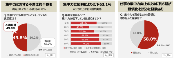 さらに6割以上は「加齢で集中力は落ちる」と感じているという結果も示された。年代別に見ると、40代(69.5%)を境に集中力の低下を感じる割合が高くなり、50代では69.5%、60代では74.0%が、集中力の低下を実感しているという結果になった。