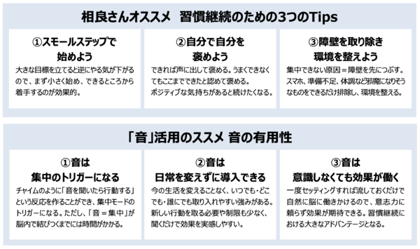 また相良さんは、「音」も習慣化に活用しやすいトリガーだと解説する。音には、「生活を変えずに導入でき」かつ、「意識せずに作用する(受動的に効果を受けられる)」という特徴がある。コーヒーや運動と違い、流すだけでいい。言い換えれば、 意志力の必要ないトリガーということだ。