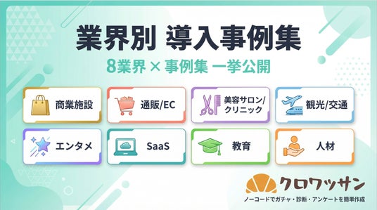 株式会社on the bakery(本社:神奈川県横浜市)は、ノーコードでオンラインガチャ・診断・アンケートを作成できるマーケティングツール「クロワッサン」において、業種別の活用イメージをまとめた事例集(PDF・8カテゴリ分)を同時公開したことをお知らせします。