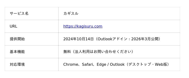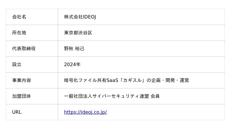 株式会社IDEOJ(本社:東京都渋谷区、代表取締役:野秋 裕己、以下「IDEOJ」)は、パスワードレスのファイル暗号化サービス「カギスル」のMicrosoft Outlook アドインを、Microsoft AppSource(旧 Office ストア)にて公開しました。Outlookのメール作成画面から直接ファイルを暗号化・添付でき、パスワード付きZIPの送付(いわゆるPPAP)を"メールの操作だけ"で置き換えることが可能になります。