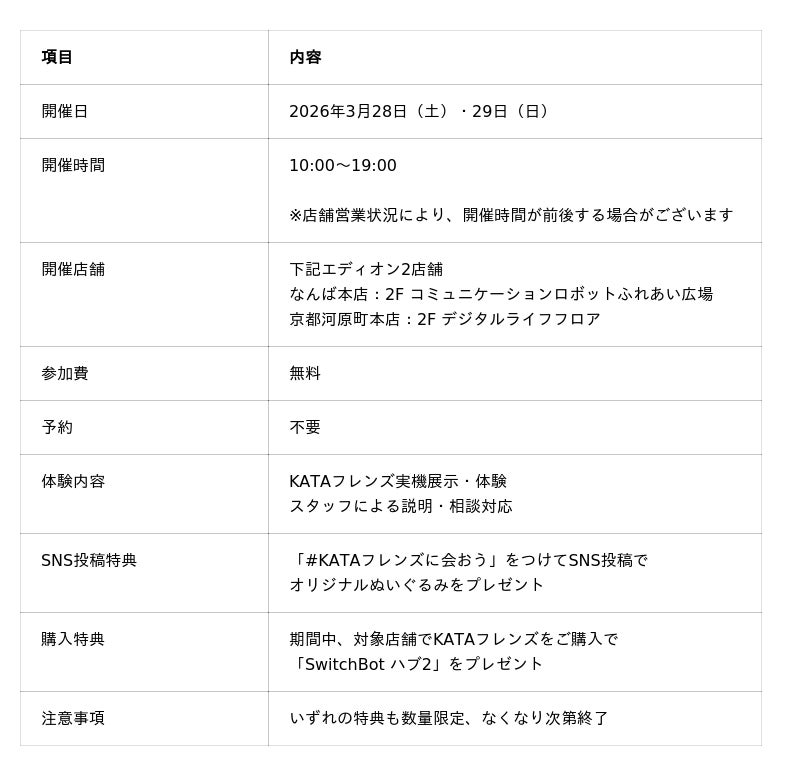 IoT・スマートホーム事業を手掛ける「IoTデバイスNo.1ブランド(※2022年11月 家電Biz調べ )」のSWITCHBOT株式会社(本社 : 東京都渋谷区)は、2026年3月28日(土)・29日(日)の2日間、エディオンなんば本店、京都河原町本店にて、成長型AIパートナーロボット「KATAフレンズ」の魅力を直接体感いただける体験イベントを開催いたします。