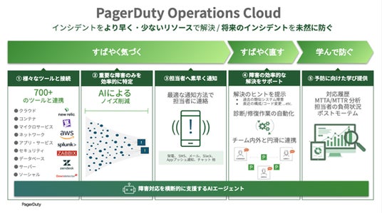 PagerDuty Operations Cloudは、独自のAI技術(PagerDuty AI Ops)と自動化機能(Process Automation)を統合したプラットフォームです。インシデント対応のライフサイクル全体-「検知」「トリアージ」「動員」「協力・解決」「学習・予防」-を統合管理する仕組みを備えており、組織全体の対応スピードと品質向上を支援します。