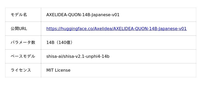 【2026年3月25日】Axelidea株式会社(Minoru IP Group、本社:大阪府大阪市、代表:西田 泰士、読み:アクセリディア、以下「当社」)は、14Bパラメータの日本語特化大規模言語モデル「AXELIDEA-QUON-14B-Japanese-v01」(QUON:Quantum Universal Originative Nucleus、クオン)を公開いたします。