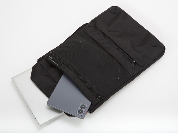 最大の特徴は、バッグ内部に備えてある着脱式のテックオーガナイザーです。15〜16インチのノートPCと13インチのタブレットを同時に収納できるほか、充電用のアダプターやマウス、ケーブル類もまとめて整理できます。