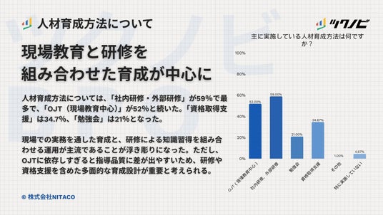 人材育成方法としては、「社内研修・外部研修」が59%で最も高く、「OJT(現場教育中心)」が52%で続きました。「資格取得支援」は34.7%、「勉強会」は21%でした。「特に実施していない」は4.7%となっています。