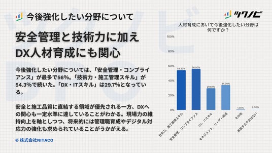 今後強化したい分野では、「安全管理・コンプライアンス」が56%で最も高く、「技術力・施工管理スキル」が54.3%で続きました。「マネジメント・リーダー育成」は34%、「DX・ITスキル」は29.7%となっています。