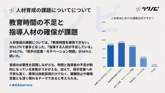 人材育成の課題では、「教育時間を確保できない」が53.7%で最も高く、「指導する人材が不足している」が48.7%、「若手の定着・モチベーション問題」が45%で続きました。「教育体制・ノウハウ不足」は19.3%でした。
