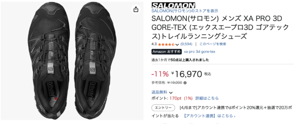 SALOMONのXA PRO 3D GORE-TEX トレイルランニングシューズが、現在Amazonにて11%OFFの16,970円で販売されています!