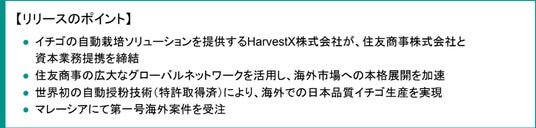 イチゴの自動栽培ソリューション「HarvestX」の開発・販売を手掛けるHarvestX株式会社(本社:東京都文京区、代表取締役:市川友貴、以下「HarvestX」)は、住友商事株式会社(本社:東京都千代田区、以下「住友商事」)と資本業務提携契約を締結したことをお知らせします。あわせて、マレーシアにおける第一号案件の契約締結をご報告します。