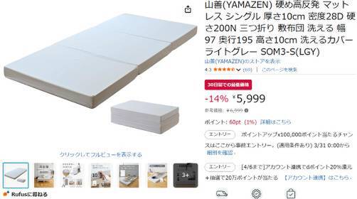 山善(YAMAZEN)の三つ折りマットレス「硬め高反発マットレス SOM3-S(LGY)」がAmazonで割引対象。参考価格6,999円のところ、14%オフの5,999円で販売中。