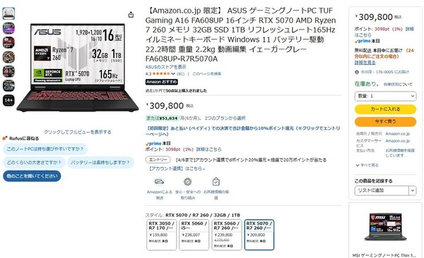 Amazon.co.jpにて、ASUSの16型ゲーミングノートPC「TUF Gaming A16 FA608UP」が販売中だ。価格は30万9800円。
