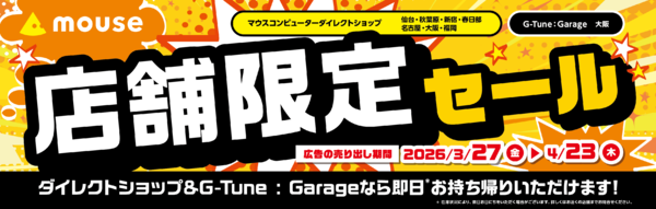 マウスコンピューターでは、3月27日から4月23日までの期間限定で、「マウスコンピューターダイレクトショップ」と「G-Tune : Garage大阪」にて特別セールを開催する。配信やゲーム、3Dモデリングに適した高性能ノートPCや、クリエイティブ作業に最適なデスクトップPCが特別価格で提供される。