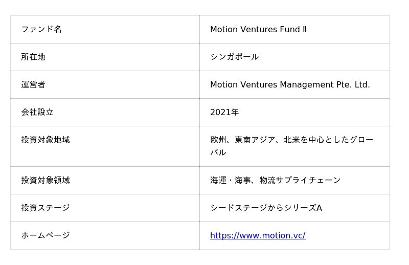 株式会社MOL PLUS(代表:阪本 拓也、本社:東京都港区、以下「MOL PLUS」)は、海運・海事領域に特化したベンチャーキャピタル(VC)であるMotion Ventures Management Pte. Ltd.(共同創設者兼ジェネラル・パートナー:Shaun Hon、本社:シンガポール、読み:モーションベンチャーズマネジメント、以下「Motion Ventures」)が運営する Motion Ventures Fund II(註1)への出資を決定しました。本出資は、2021年に実施したMotion Ventures Fund Iへの出資(註2)に続く継続出資であり、両社のパートナーシップをさらに強化するものです。