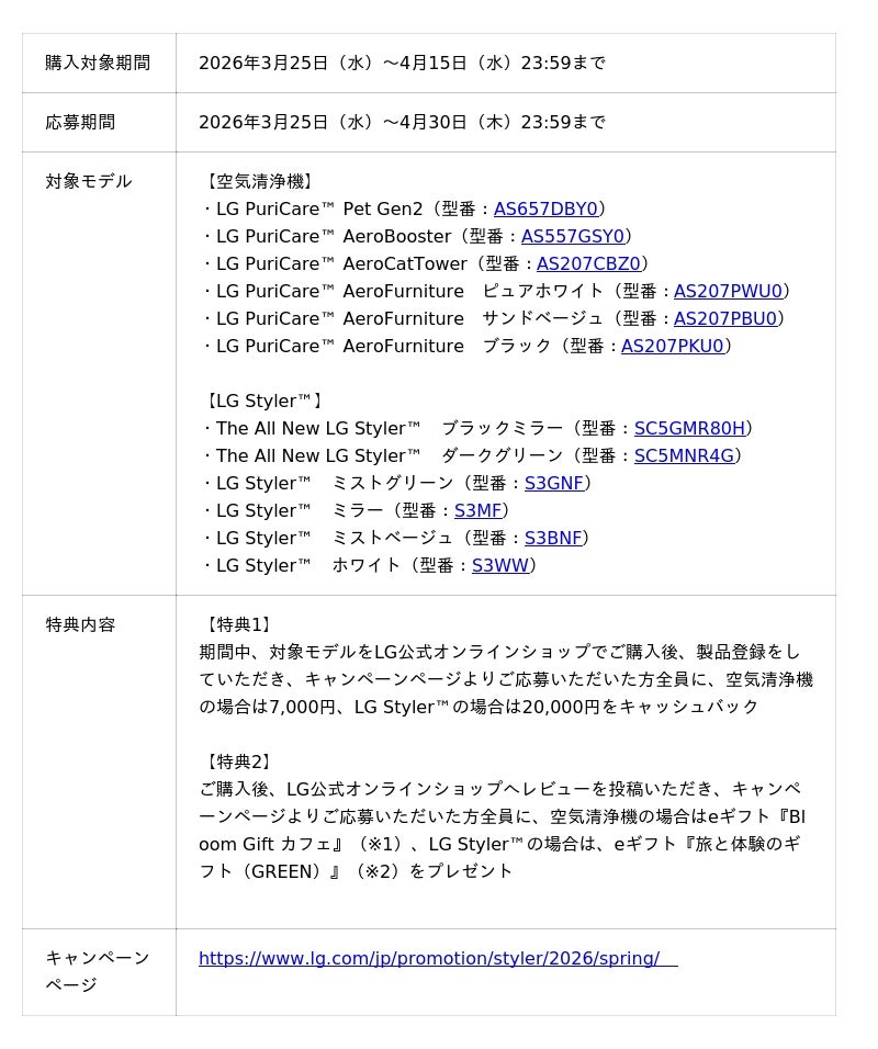 LGエレクトロニクス・ジャパン株式会社(代表取締役:孫 成周(ソン・ソンジュウ) 本社:東京都中央区)は、空気清浄機および衣類ケア家電「LG Styler(TM)」対象モデルのご購入でキャッシュバック、さらにレビュー投稿でeギフト(デジタルギフト)をプレゼントするLG公式オンラインショップ限定キャンペーンを、本日2026年3月25日(水)より実施します。