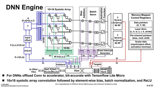 次にDNN PEの中身が下の画像である。まず16行16列の行列演算器(Systolic Array)があり、ここでの合計を合算して(Bias Addition)、正規化し(Batch Norm)、最後にアクティベーションするという、もう本当にCNNの演算だけを行なう仕組みになっている。