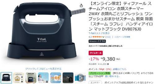 ティファールの衣類スチーマー「スチーム ラフレ(DV8076J0)」がAmazonタイムセール対象。参考価格11,300円のところ、17%オフの9,380円で販売中。