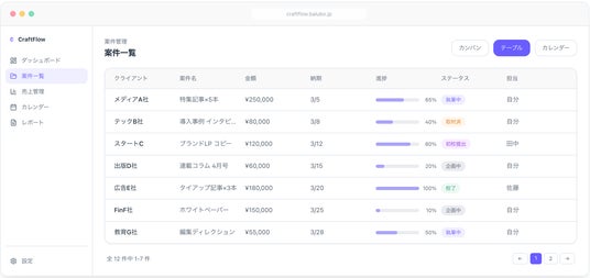 案件が増えてきて、スプレッドシートでの管理に限界を感じている方。「今月の売上はいくらか」「来月の入金はいつか」をすぐに確認したい方。CraftFlowなら案件を登録するだけで、売上集計・入金予測・納期管理が自動化されます。