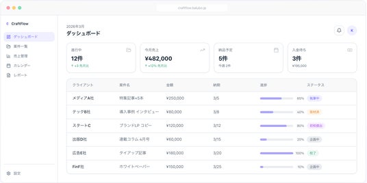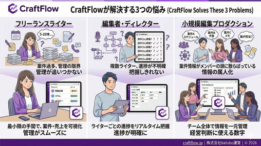 株式会社balubo(本社:東京都渋谷区、代表取締役:君和田郁弥)は、フリーランスのライター・編集者向けの案件・売上管理ツール「CraftFlow(クラフトフロー)」を2026年3月25日にリリースしました。