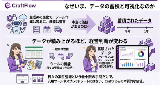 CraftFlowは、このデータの蓄積と可視化に特化しています。日々の案件登録という最小限の手間だけで、フリーランスが「経営判断に使える数字」を手に入れられる。それが、汎用的なプロジェクト管理ツールやスプレッドシートにはない、CraftFlowの本質的な価値です。