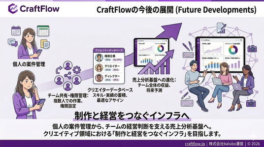 CraftFlowは今後、チーム向けの共有機能や権限管理、クリエイターデータベースの強化を予定しています。クリエイターが「制作に集中できる環境」を整える基盤として、継続的に機能を拡充してまいります。