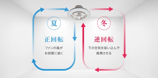 夏は正回転(下向き)でファンの風をお部屋に届け、冬は逆回転(上向き)で床付近の冷たい空気を吸いこんで循環させることができ、オールシーズンで活躍します。