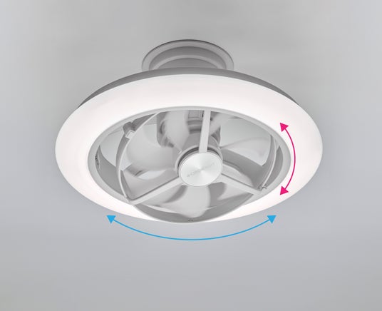 スマートフォンなどのデバイス操作やアレクサによる音声操作、または付属のリモコンを使用して、ファン部分の角度を2段階に調整可能です。角度は、小さなスペースに集中的に風を届ける約12度と、部屋の広範囲に風を届ける約18度の2段階から選択可能です。角度調整後は、部屋全体に風を行き渡らせるオートスイング機能により、効率的な空気循環を実現します。さらに、スイング速度も2段階で調整できます。