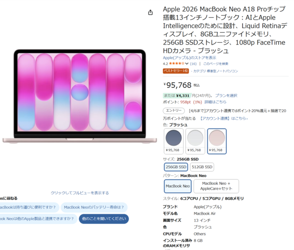 3月11日発売の低価格Macが、Amazonで安く買える!Appleの新型ノートPC「MacBook Neo」がAmazonでは95,768円で販売中です。Apple公式サイトの販売価格99,800円なので、それより安く購入できちゃいます!