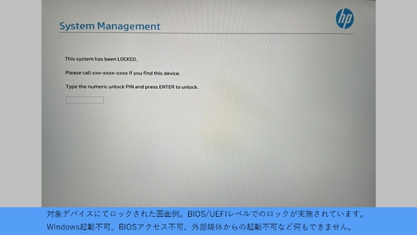 リモート消去機能の画面。単にデータが消えるだけでなく、データ消去の上PCをBIOSの手前でロックも可能な点もポイントだ。既存のMDMでもリモートロック、ワイプはできるが、HPのソリューションでは電源がOFFでも機能するのが特徴だ。