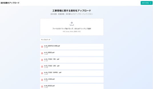 1. 担当者が設計図書をアップロード設計図書 (図面、仕様書、見積書)をドラッグ&ドロップもしくはファイル選択にてアップロードします。