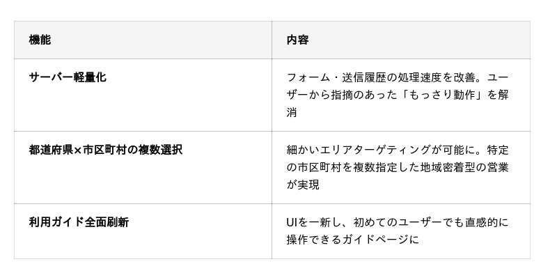 今回のアップデートでは、AI重複送信防止機能と3段階確認送信を搭載し、営業自動化における誤送信・重複送信のリスクを構造的に排除。あわせてサーバー軽量化による操作速度の大幅改善、エリアターゲティングの強化、利用ガイドの全面刷新を実施しています。