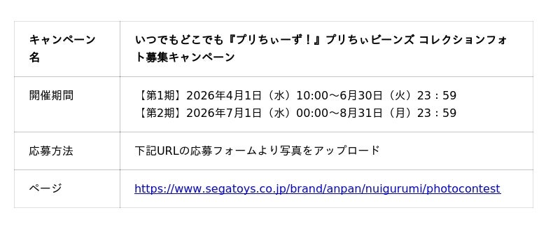 株式会社セガ フェイブ(本社:東京都品川区、代表取締役社長執行役員:杉野行雄、以下セガ フェイブ)は、アンパンマンのぬいぐるみシリーズ『プリちぃビーンズ コレクション』を使った「いつでもどこでも『プリちぃーず!』プリちぃビーンズ コレクションフォト募集キャンペーン」を2026年4月1日(水)より開催します。