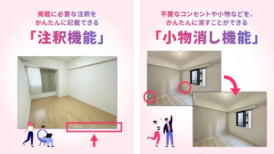 さらに今回のアップデートでは、AI生成であることを明示する「注釈表示機能」や、生活用品や装飾品などの小物を除去できる「小物消し機能」の追加に加え、360度パノラマ画像へのAI家具消し・配置対応も実現。スペースリーに保存されたあらゆる物件コンテンツの品質を包括的に高めることが可能になりました。
